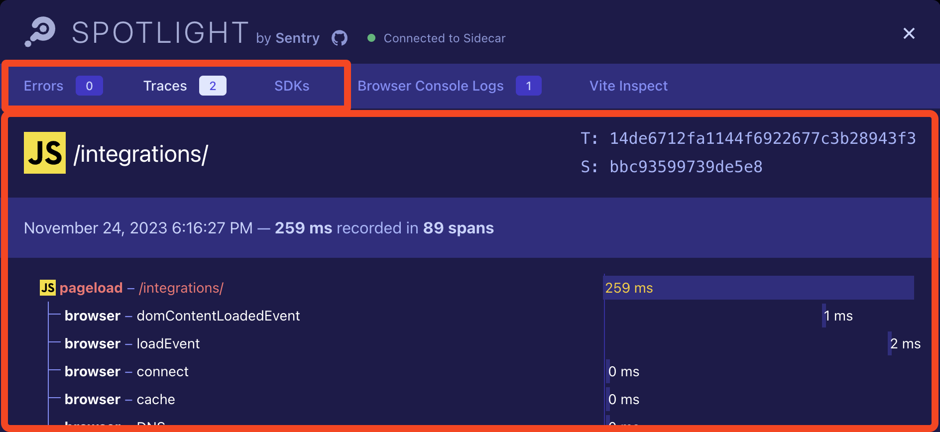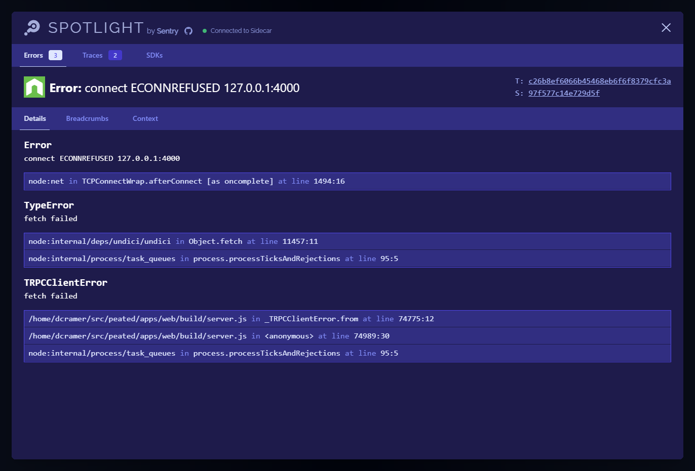 Take the power of Sentry's telemetry and bring that into your development environment with Errors and Traces in both Frontend and Backend.
